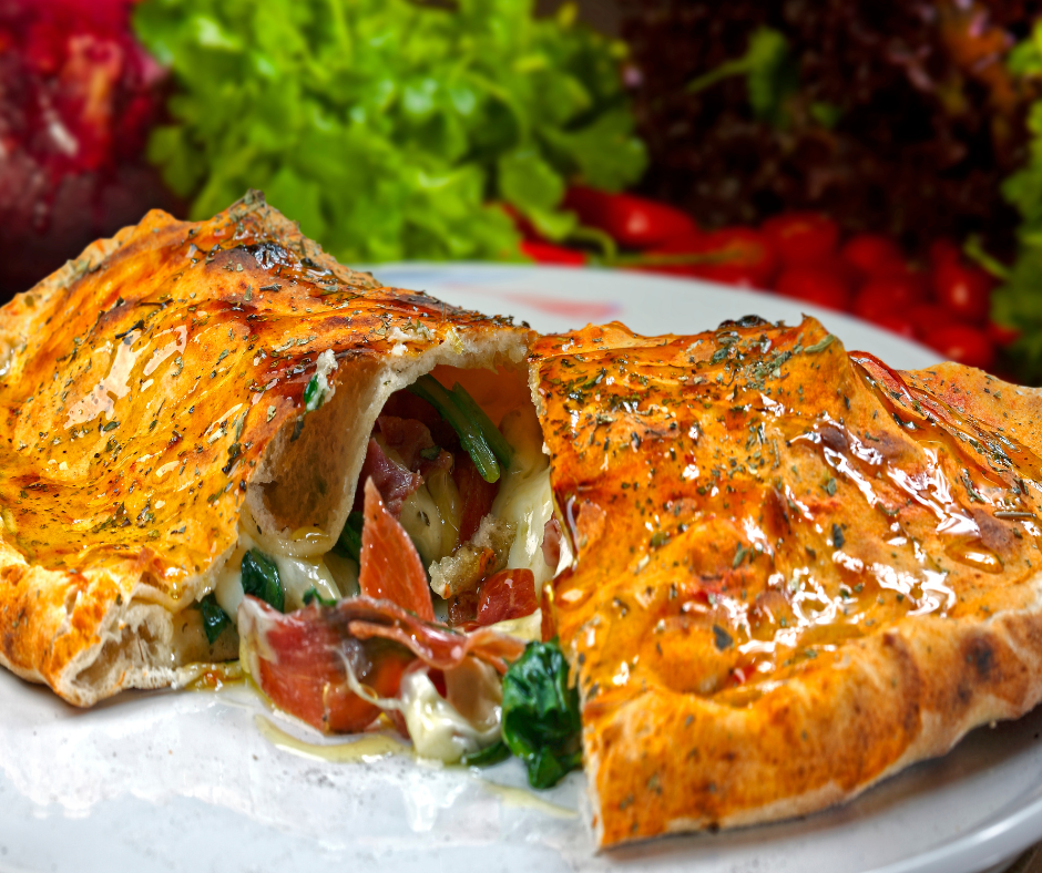 ¿Sabías que? El calzone es una deliciosa creación de la cocina italiana que se originó como una versión portátil de la pizza tradicional. Este platillo, que literalmente significa “pantalón” en italiano, es una especie de pizza doblada sobre sí misma, formando una empanada grande que puede ser fácilmente transportada y comida sin necesidad de cubiertos. Su masa crujiente y dorada encierra una variedad de rellenos que típicamente incluyen queso mozzarella derretido, carnes como el salami o el jamón, y una generosa porción de vegetales frescos como champiñones, espinacas y tomates.